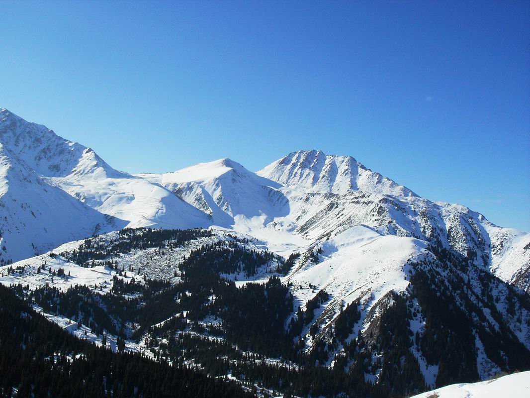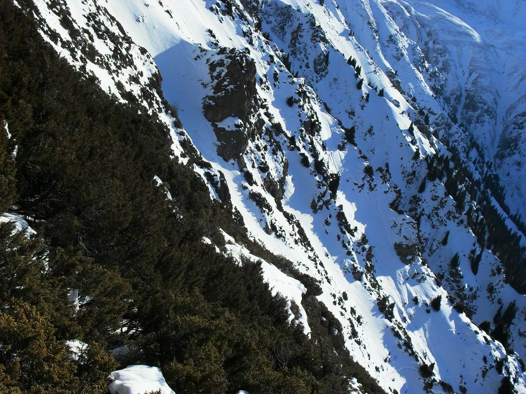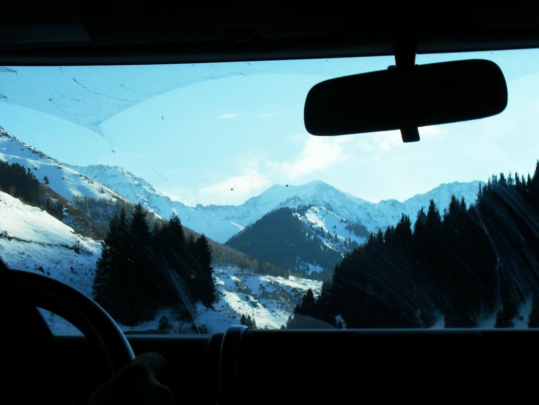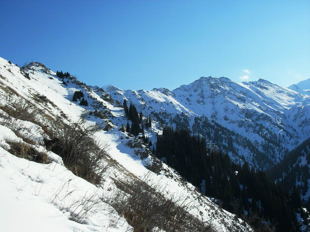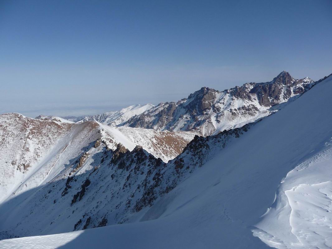 А вот мой любимый Большой Алматинской пик! Прошедшей осенью я пробовал подняться на него. И еще раз, уже в одиночку, пытался, здесь, кстати, видно, как он выглядит из города, а также с обратной стороны. А вот как смешно он выглядит сбоку — как гармошка: