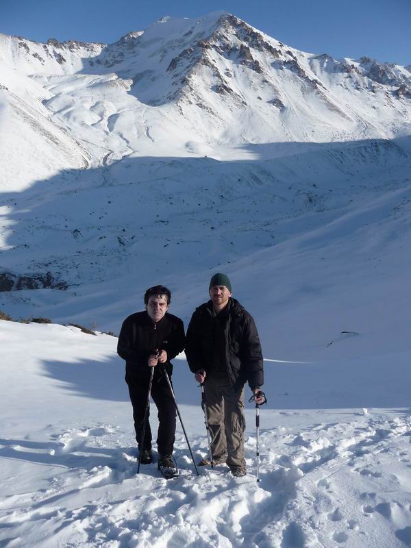 А вот мы с Мишей на фоне Молодежки, ближе к нам предвершина, а левее — сама вершина. Если провести вертикальную линию по центру фотографии, то в месте пересечения этой линии с линией тени, прямо под округлым снежным холмиком, можно увидеть черную точку — это домик, к которому мы сейчас отправимся.