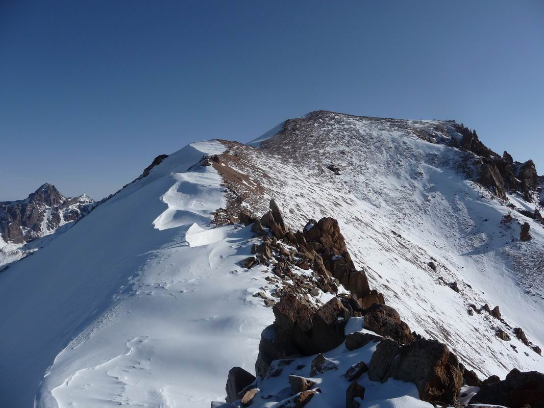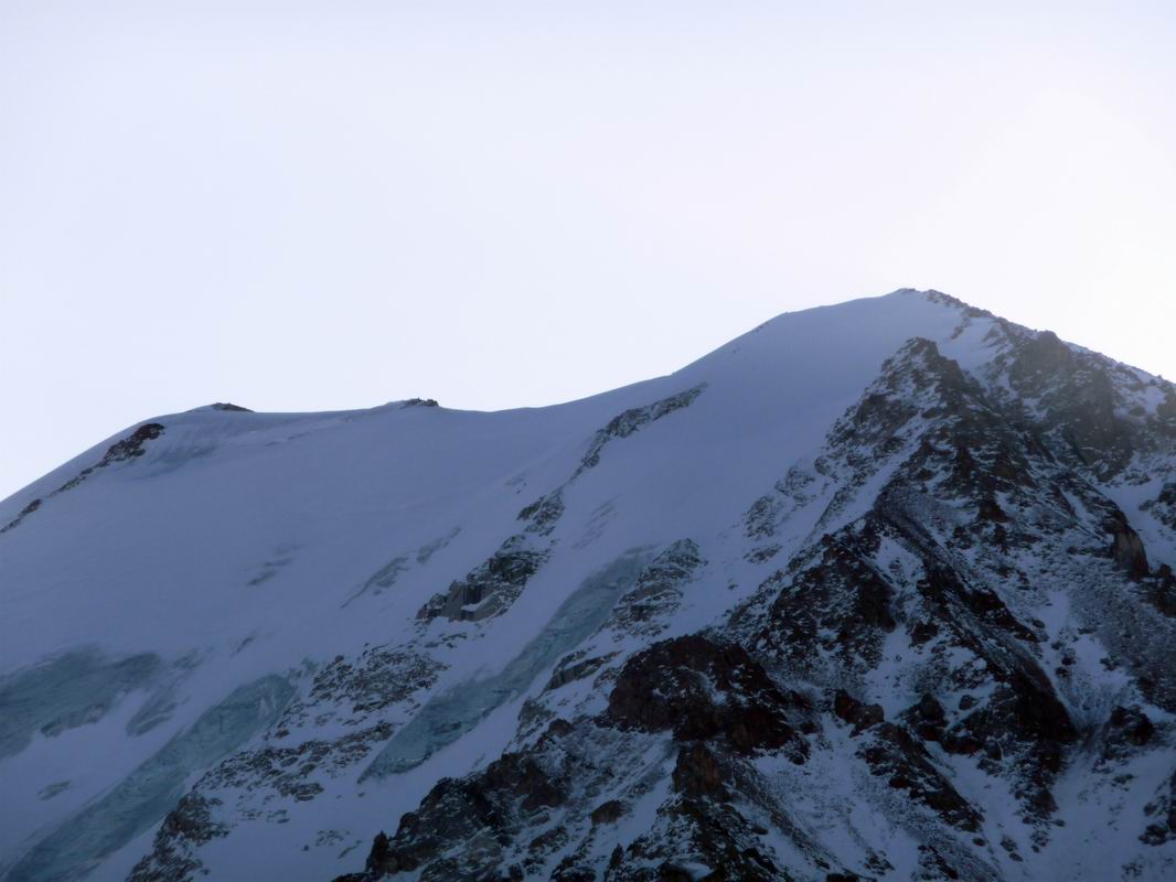 Вот вершина и предвершина в приближении. Между ними черное скальное возвышение, жандарм, о нем расскажу ниже. На склоне видны сине-зеленые участки — это вечный лед.