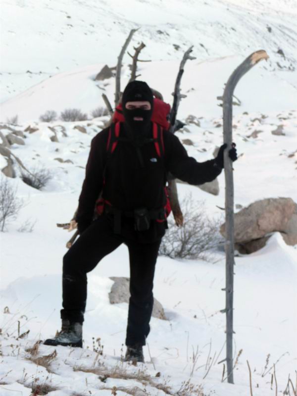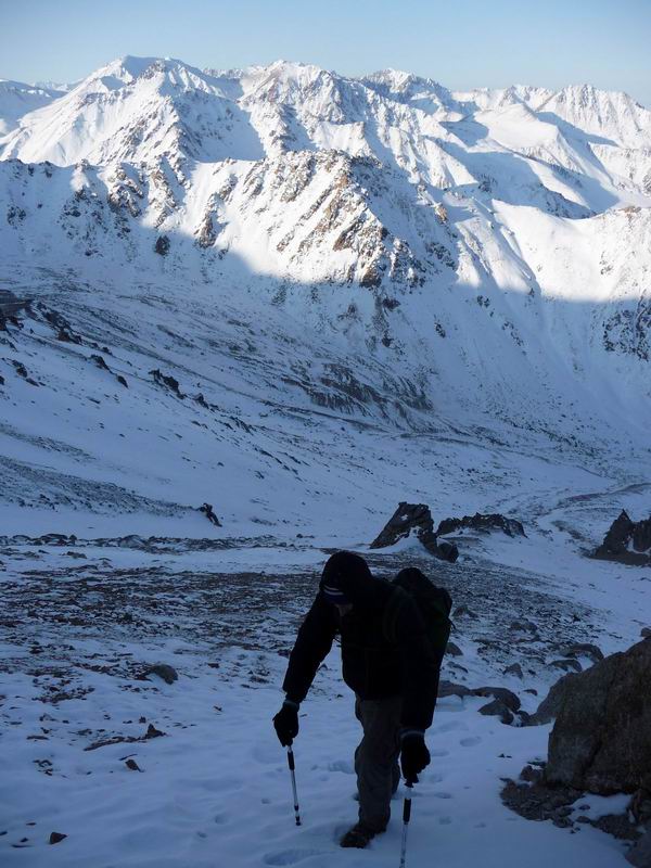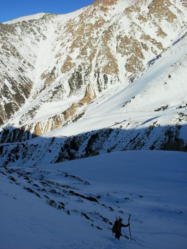 Сегодня по местным меркам тепло и почти нет ветра. На голове у меня шерстяная зеленая шапка, поверх нее еще одна толстенная двухслойная шерстяная шапка, а сверху еще и капюшон от куртки. На теле два шерстяных свитера и пуховая куртка. На каждой руке — две теплые шерстяные перчатки. Под штанами-карго еще двое штанов. На ногах под ботинками толстый шерстяной носок и еще два х/б носка. И все равно при малейшем дуновении ветерка моментально начинают сильно мерзнуть конечности, приходится на ходу, или, делая остановку, отмахивать ими, пригоняя кровь к пальцам. Отморожение в горах — одна из самых распространенных опасностей.