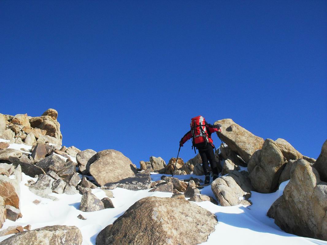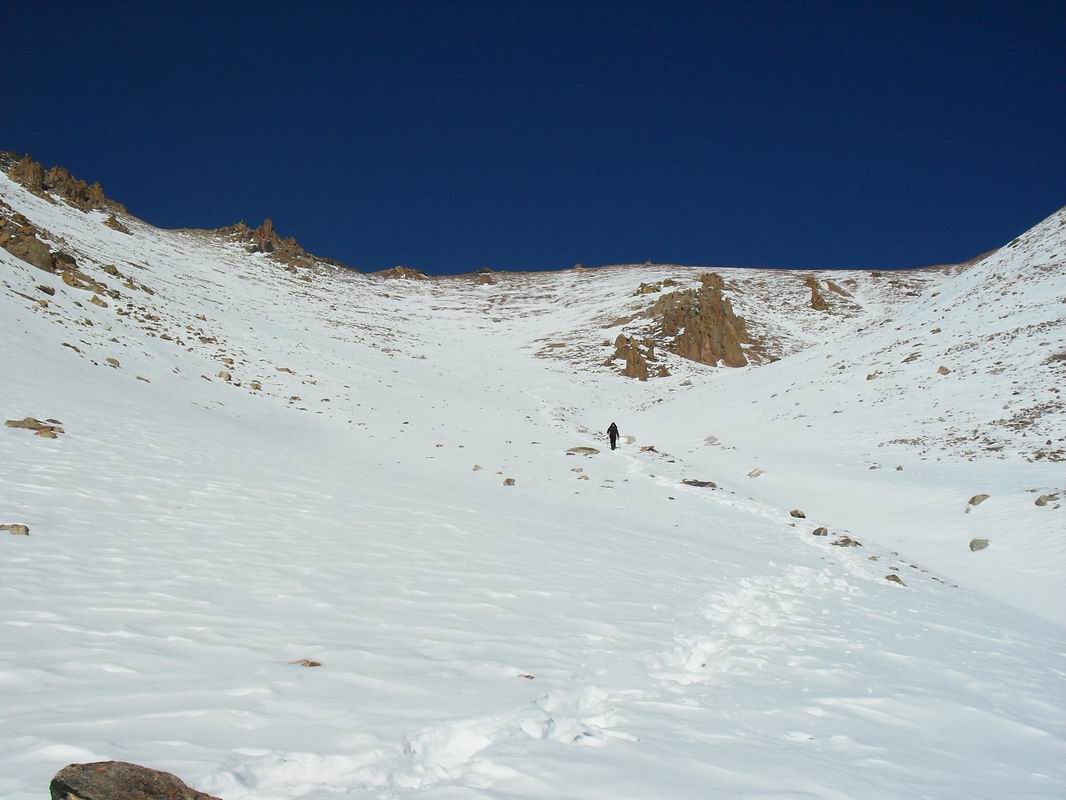 В общем, первого жандарма я кое-как прошел, а дальше мне стало страшно. Я подумал, что даже если я сейчас пройду второго жандарма и дойду до вершины, то на обратном пути, уже уставший, я должен буду опять их пройти, и тут уже шансы мои будут совсем мизерными. Миша показывает мне безопасный путь по склону и уходит на вершину один, а я спускаюсь вниз.