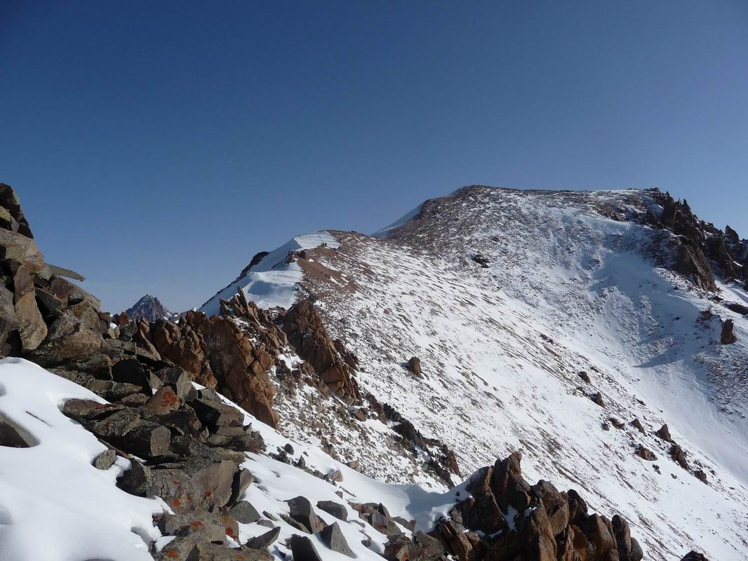 Сейчас мы выйдем из кулуара на гребень, дальше — на предвершину. Потом останется еще гребень и начнется финальный небольшой подъем на вершину.