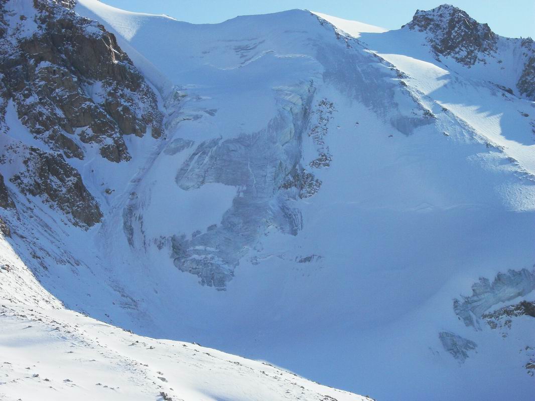 А вот висячий ледник, стекающий со склона пика Горельник. Это огромная стена чистейшего льда, смотрится очень эффектно, подобраться бы поближе…