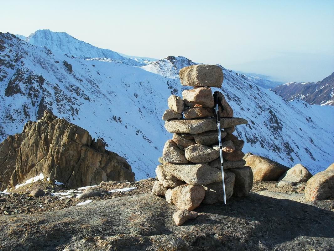 Спускаемся. В городе по-прежнему облачно. Слева виден пик Большой Алматинский. Башенка из камней — тур — служит указателем тропы. Пока что это самый большой тур из всех, что я видел, хотя, говорят, у нас встречаются туры в три человеческих роста! :-)
