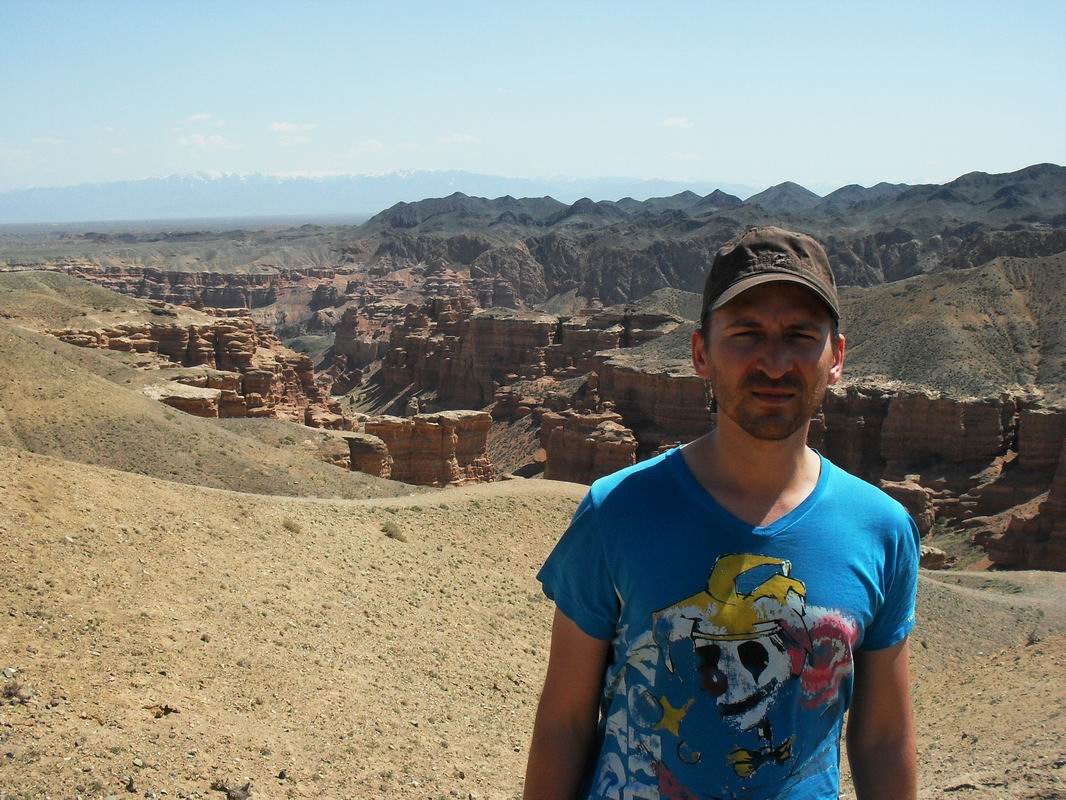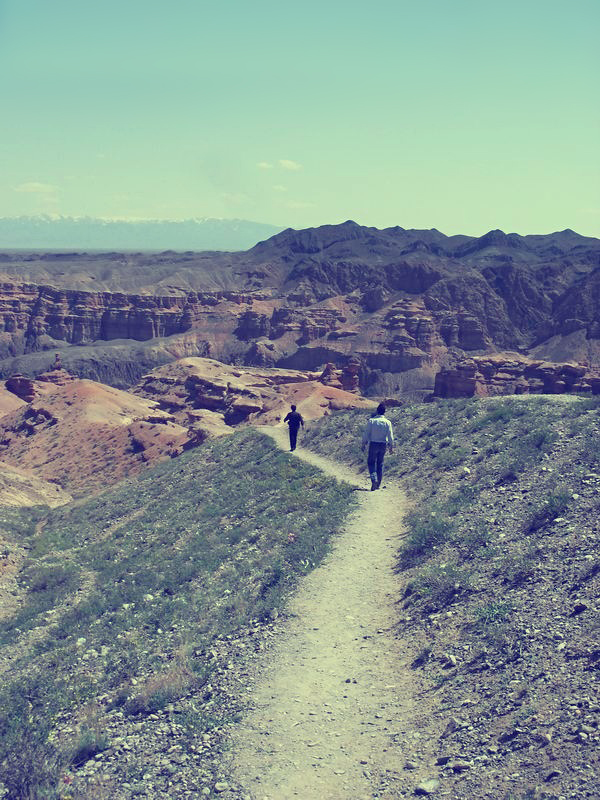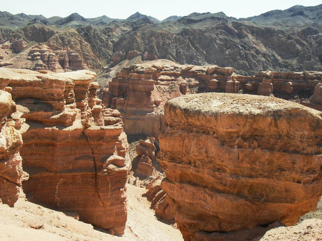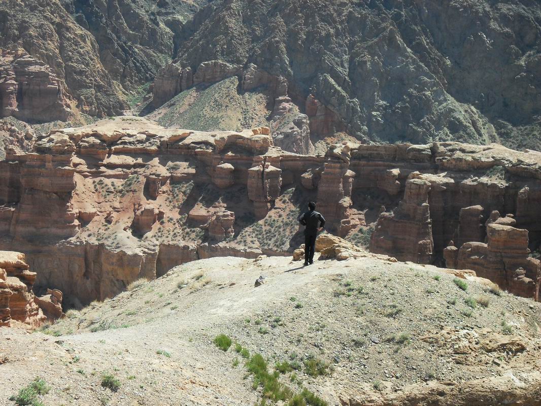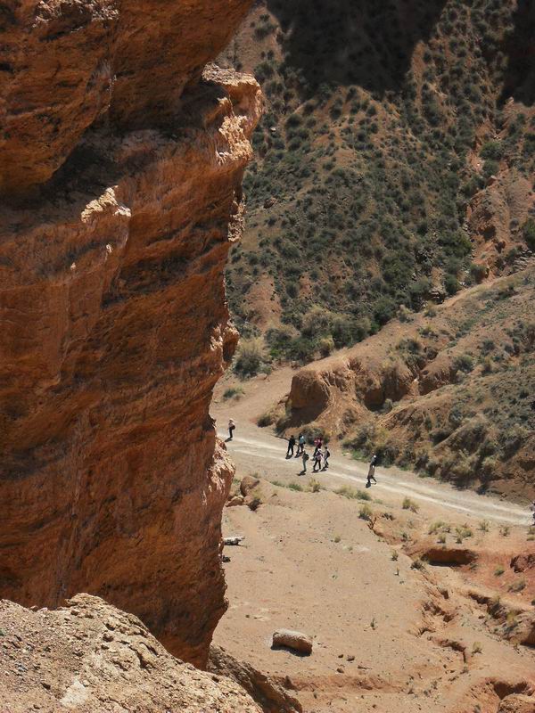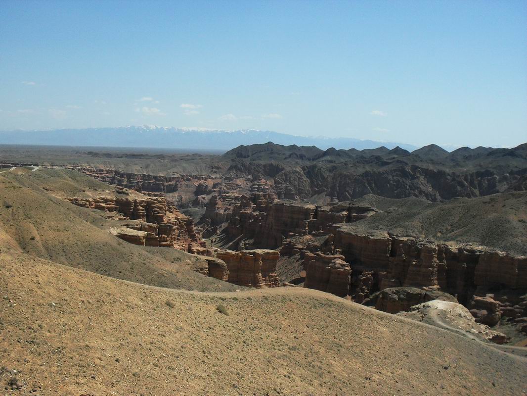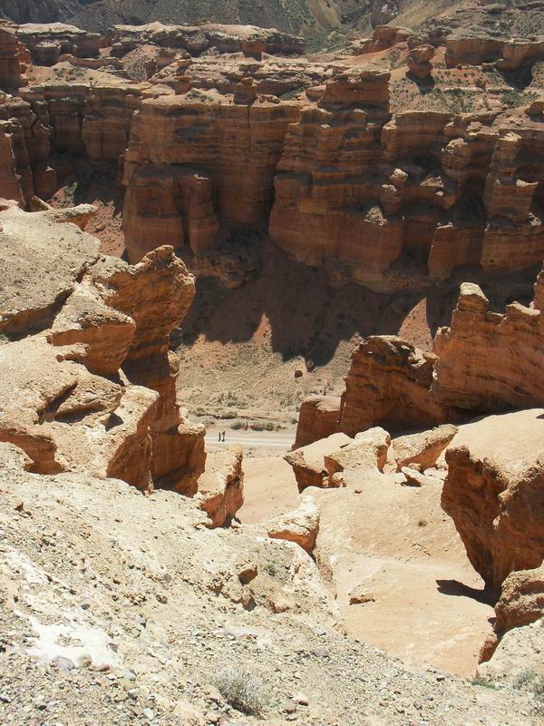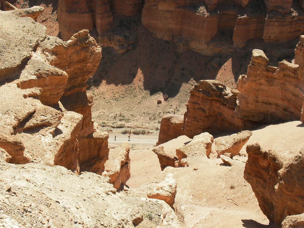 Первым делом едем смотреть Чарынский каньон. Чарын — это название реки, местами бурной и мощной, ее, в частности, рафтеры и прочие водники любят. В осадочных породах вода и непрекращающийся ветер выточили красивые глубокие каньоны с башнями замков и нагромождением валунов.