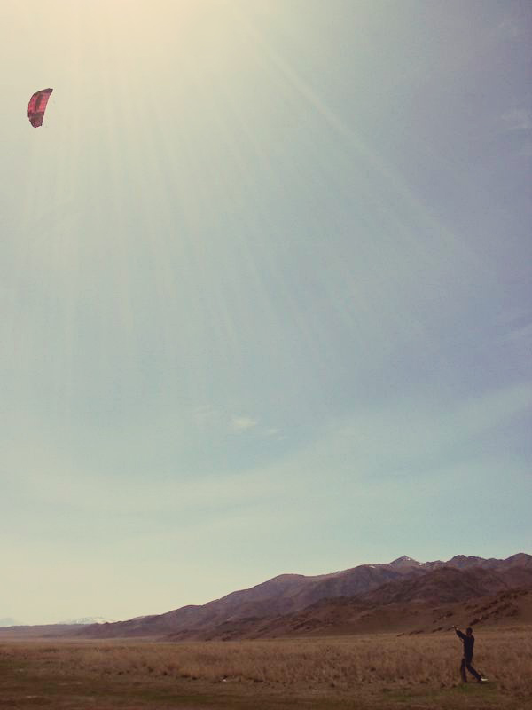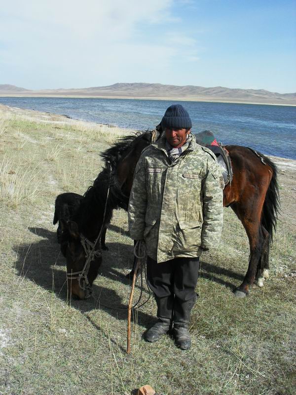 К нам подъехали чабаны. Вот этот дяденька и еще один совсем молодой очень улыбчивый, говоривший на чистейшем русском и неплохом английском. Мы познакомились с ними, а потом молодой лихо ускакал помогать Сергею вылавливать кайт из озера.