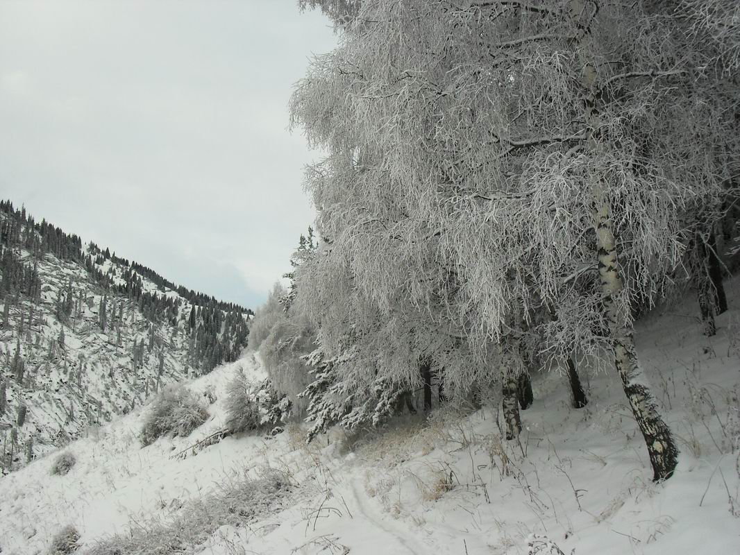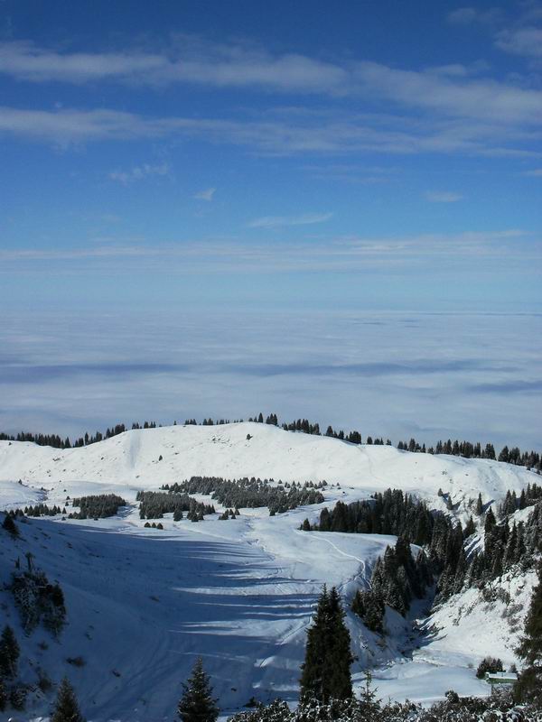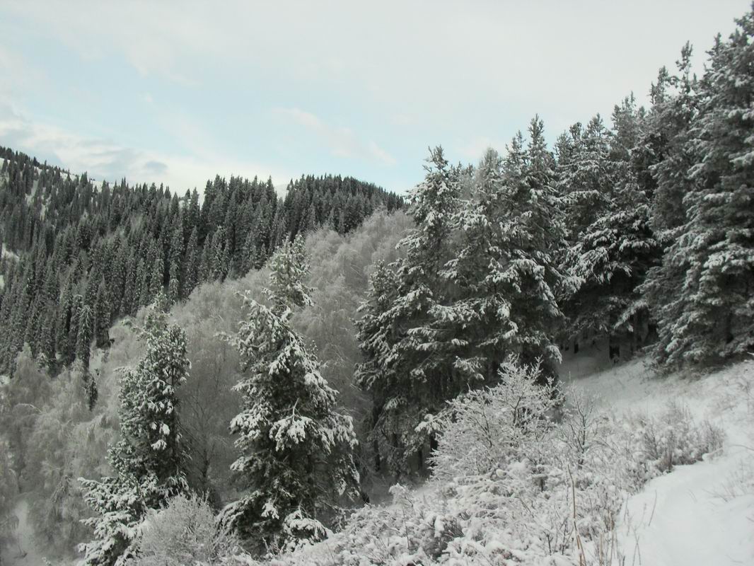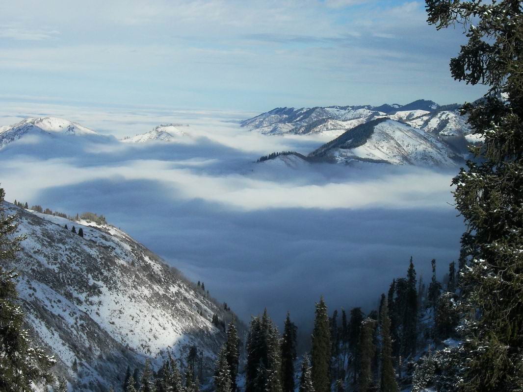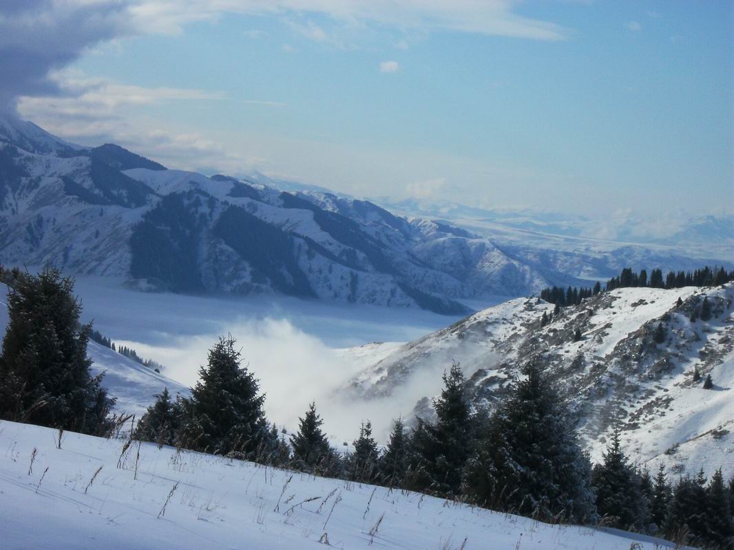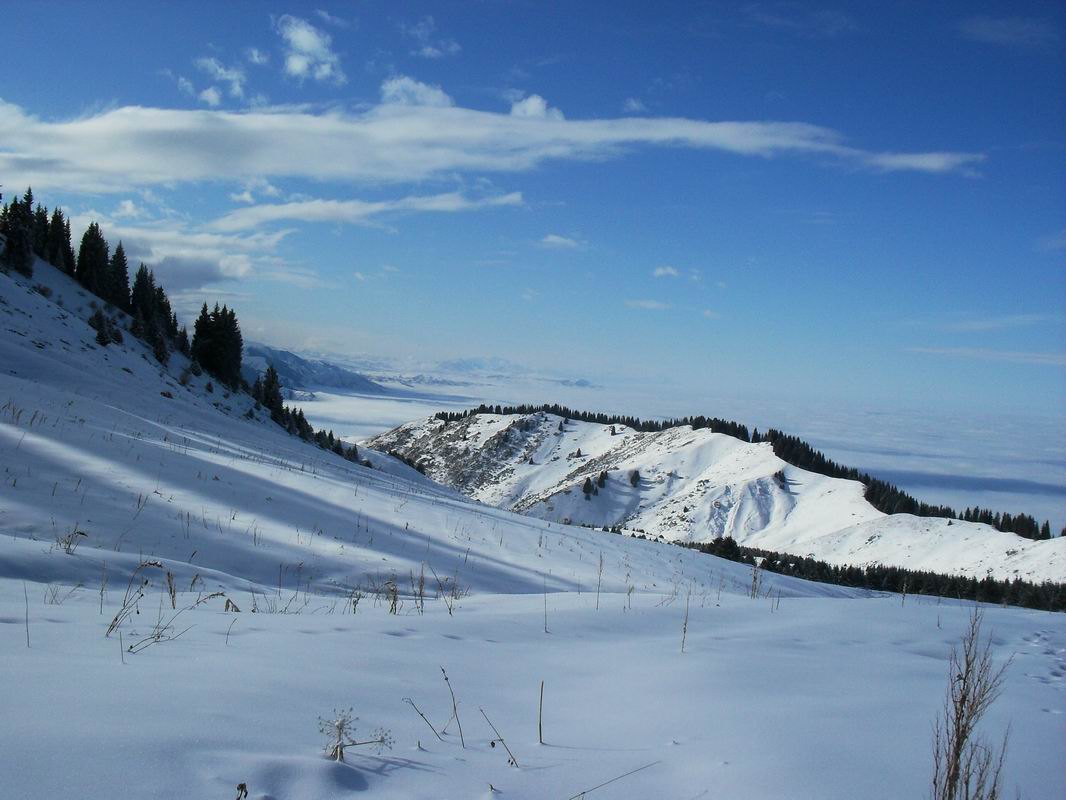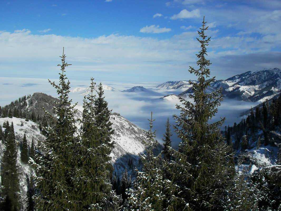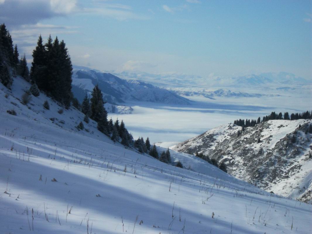 А вот как выглядит Кок-Жайляу в студеную зимнюю пору. За горами, ниже, вообще-то, Алматы, но их окутали непроницаемые облака. Или, если угодно, туман.