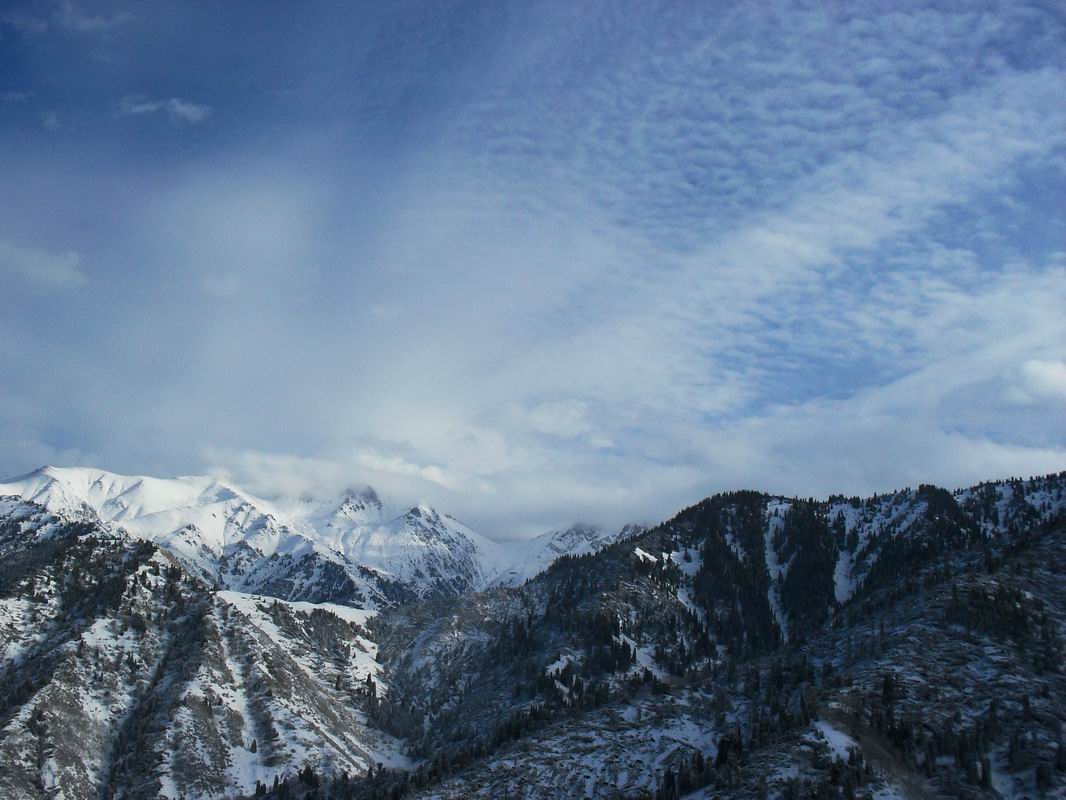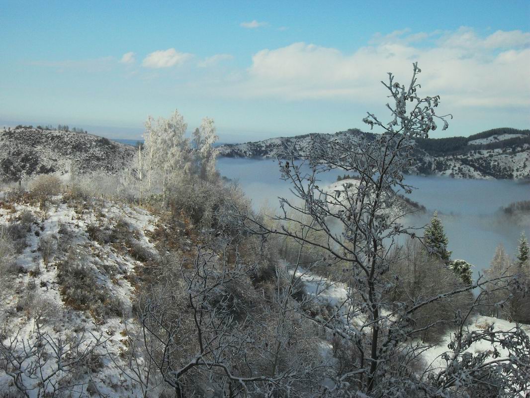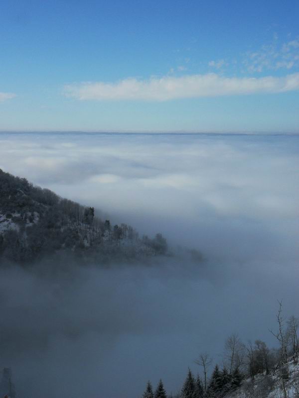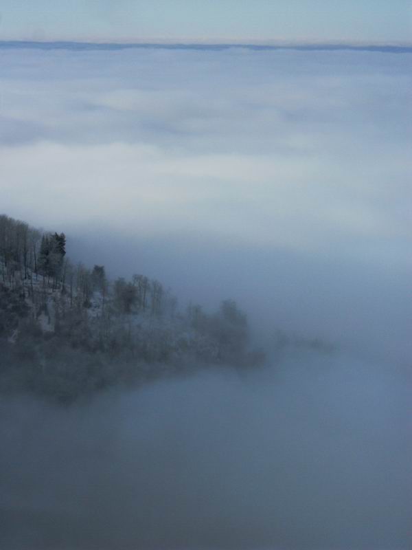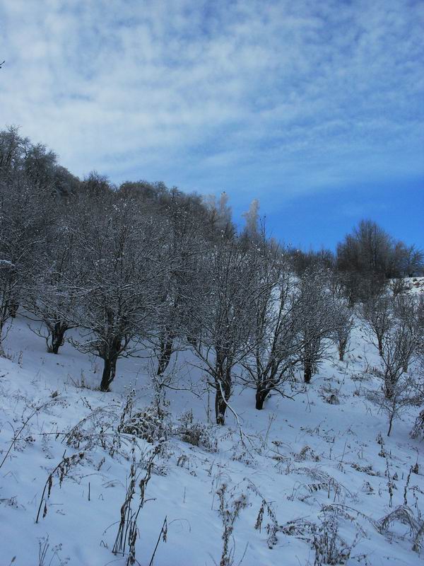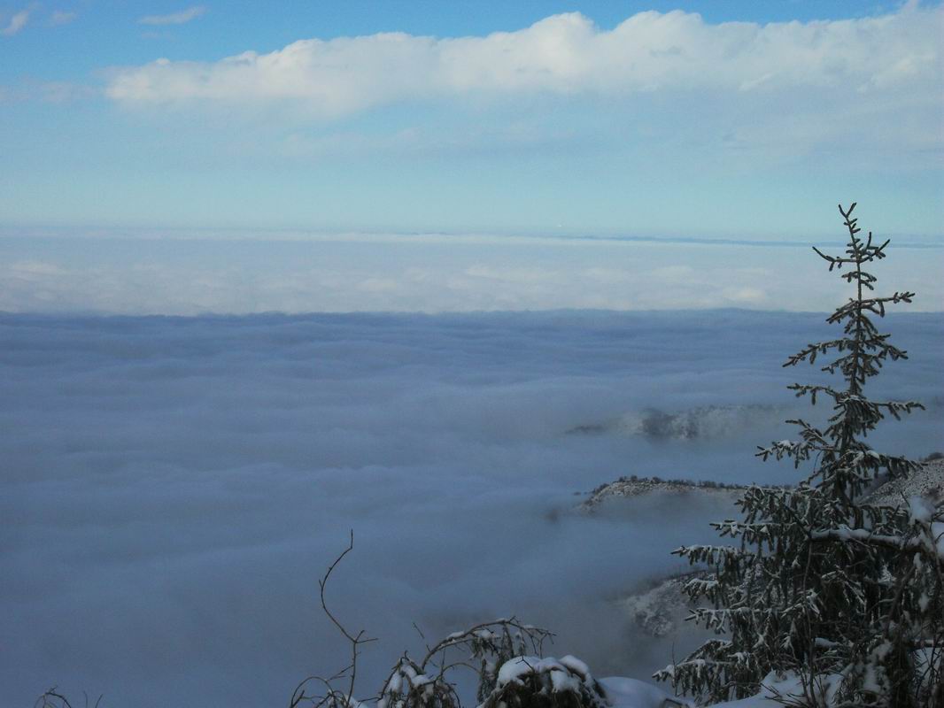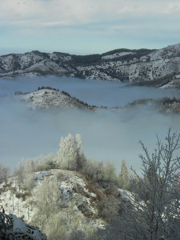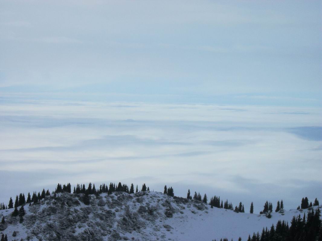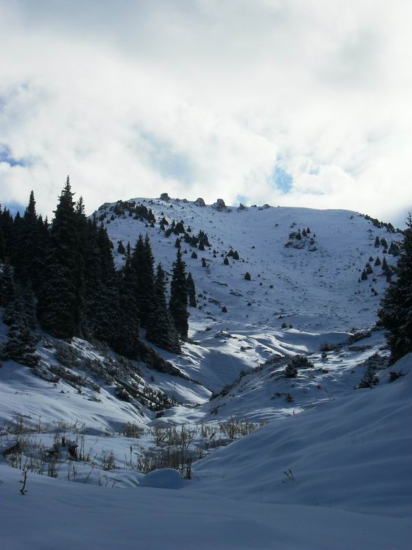 А вот как выглядит Кок-Жайляу в студеную зимнюю пору. За горами, ниже, вообще-то, Алматы, но их окутали непроницаемые облака. Или, если угодно, туман.
