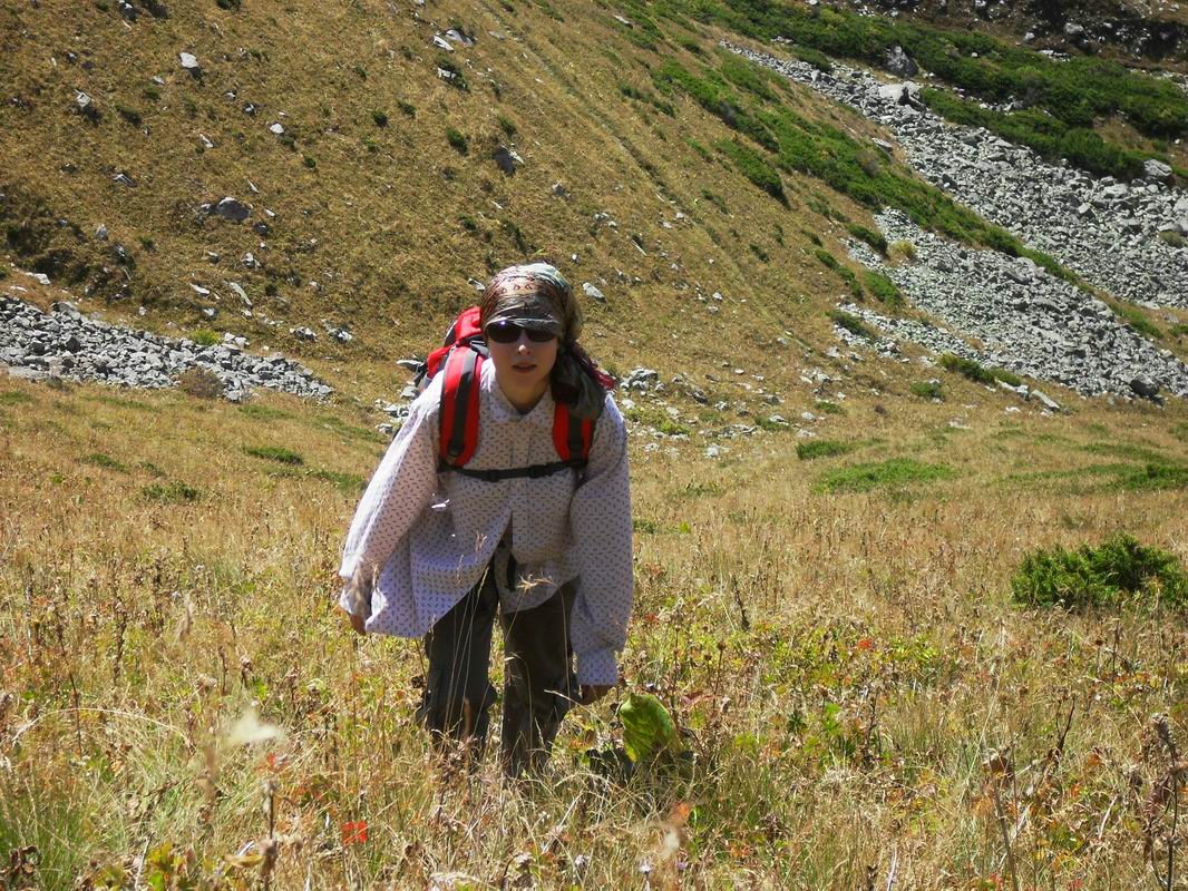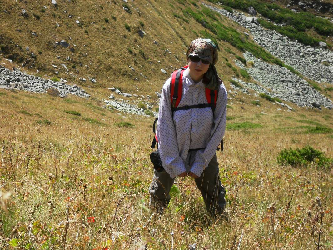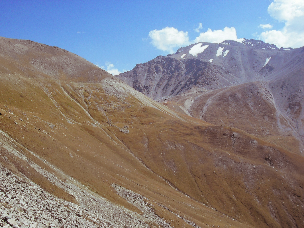 По правде сказать, мы вначале планировали одолеть пик Большой Алматинский. Виктор по доброте душевной и взялся нас проводить до начала подъема на него и рассказать, как подниматься, потому что мы ни разу не были ни на пике, ни на подступах, ни в округе, по большому счету. Итак, мы у подножия, готовы идти к перевалу, а от него уже выходить на гребень горы. Космостанция как раз стоит на перевале. Внизу, у подножия, мы с легким сердцем перешагнули через тропинку, ведущую на Космостанцию (ниже на фото тропинку видно вверху в центре) и пошуровали прямиком по склону.