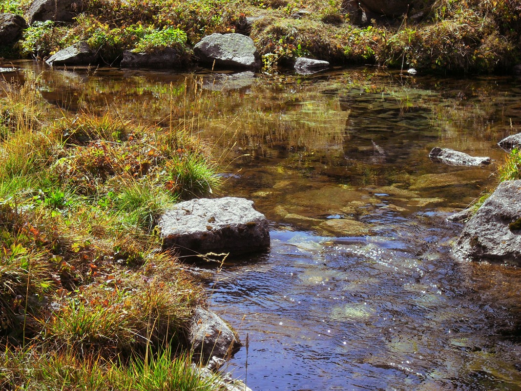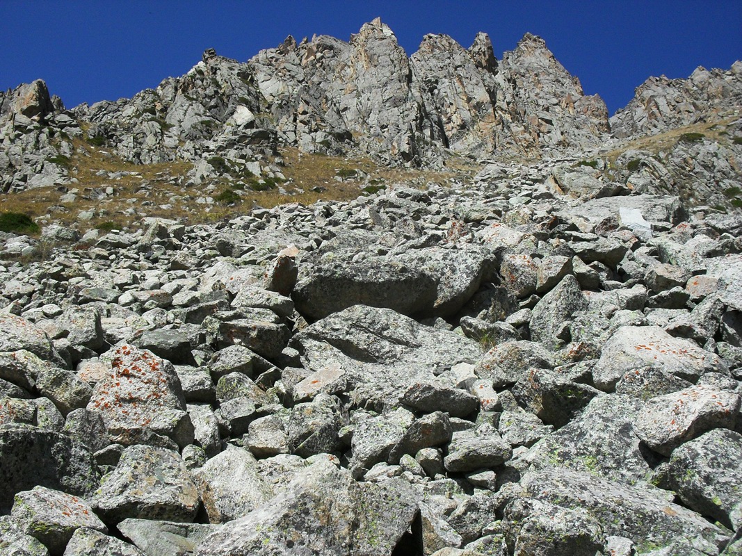 Это была не ошибка, а особенность нашего похода :-) Велико психологическое значение тропы: чувствуешь себя желанным гостем. Вот тебе не слишком крутой подъем, вот тебе, когда круто, ровные площадки, как ступеньки, чтобы ногу поставить. Но, по определению, на тропе не может быть речи о первопроходстве. Мы точно знали, что по нашему пути никто из людей не ходил — подъем всё круче, вот уже и скальные жандармы встают на пути, а склон перерезают нагромождения обломков. Жутковато их переходить. Все кажется, что ты играешь в игру: «построй башню из блоков». И кто знает, может я и есть тот последний блок, под которым башня рухнет и застывшая река придет в движение? Камни глухо рычат, когда неудачно делаешь шаг, но все хорошо, река пропускает нас.