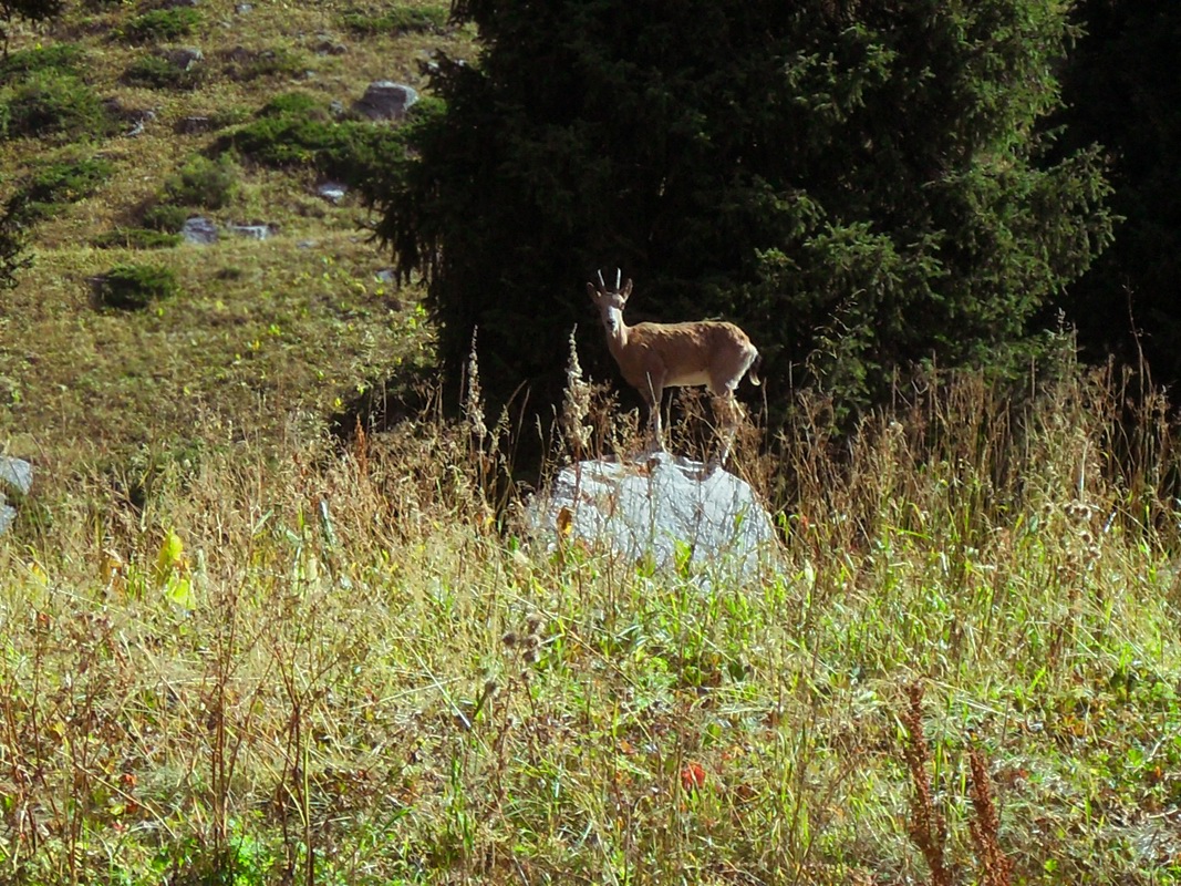 На одной из таких полян нас встретила грациозная горная козочка. Как выяснилось потом, это была разведчица, а за холмом залегло остальное семейство — месье горный козел и два горных козленка.