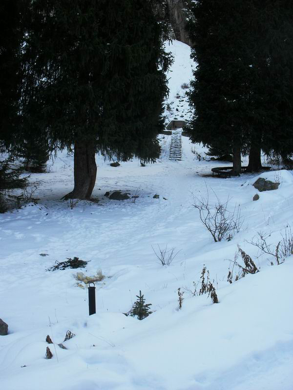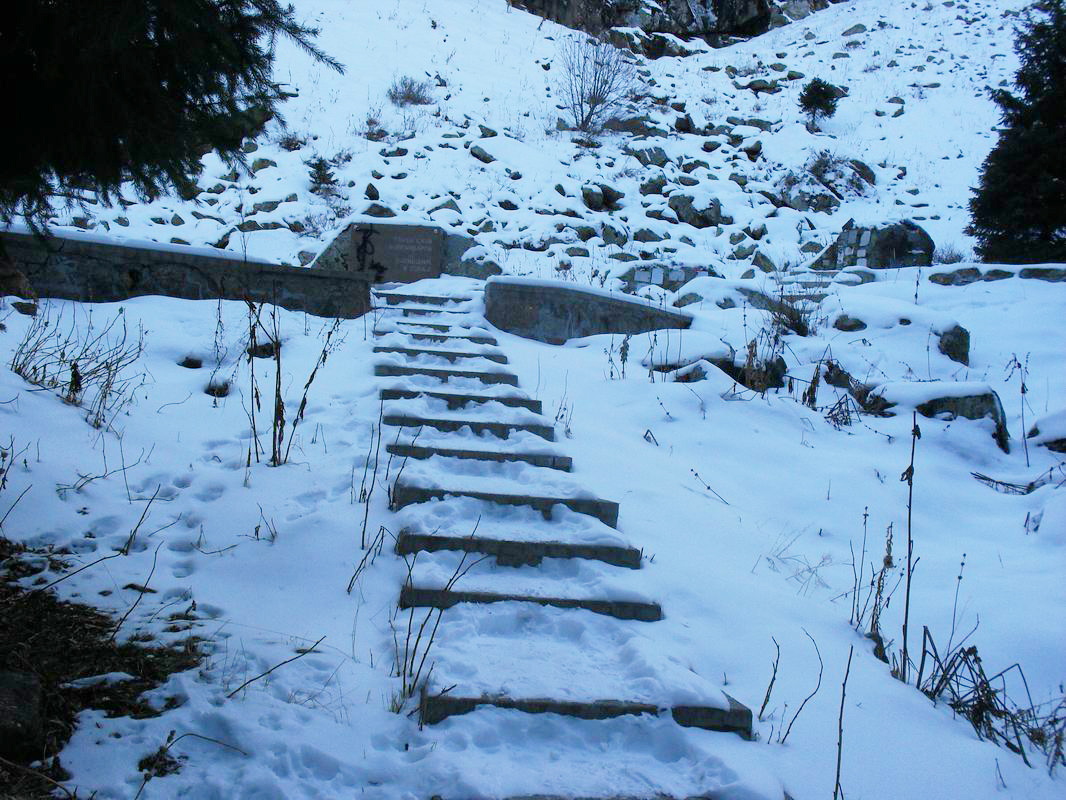 Время есть и по пути я решаю зайти на мемориал погибшим альпинистам, кажется, так он раньше назывался. С дороги его почти не видно и если не знать, что он где-то здесь, то запросто можно пройти мимо. Вон там, между деревьями, видны ступеньки.