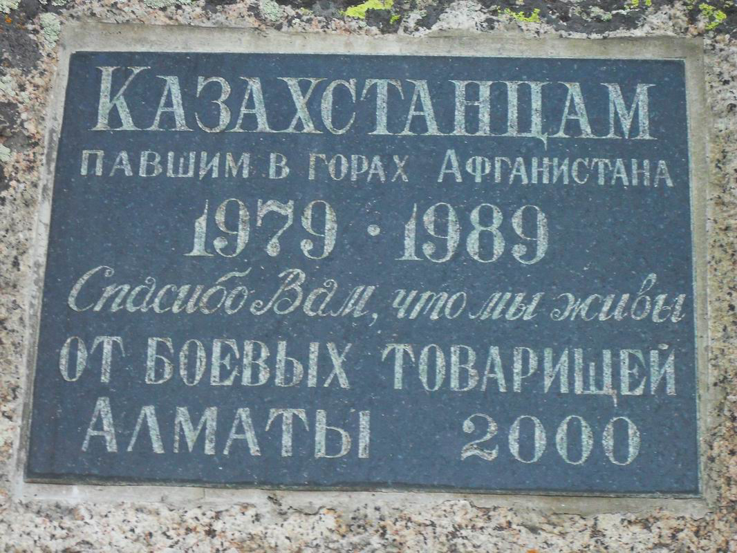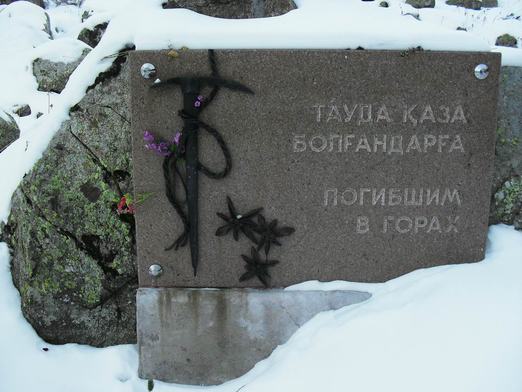На барельефной плите из красного гранита — выполненные из чугуна ледоруб с веревкой; три цветка эдельвейса, символа мужества, силы и красоты; и надпись на казахском и русском языках.
