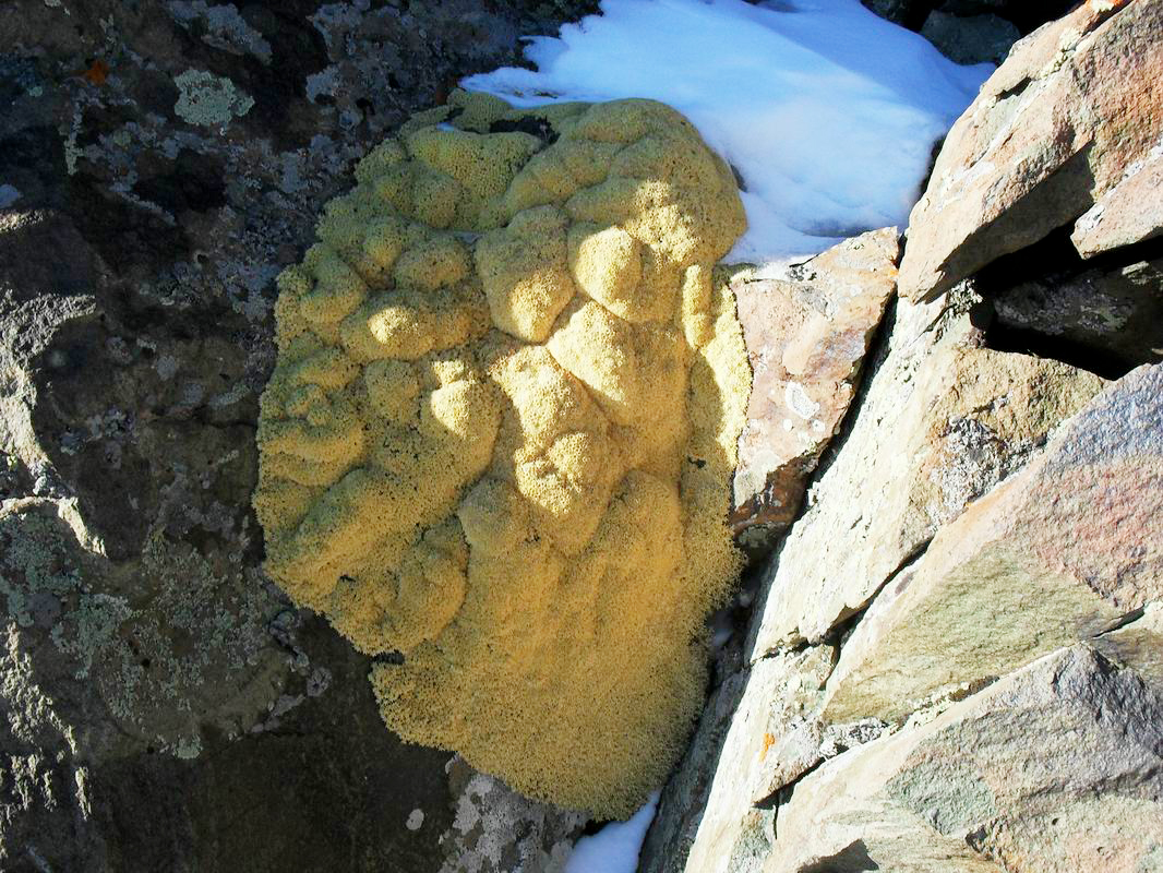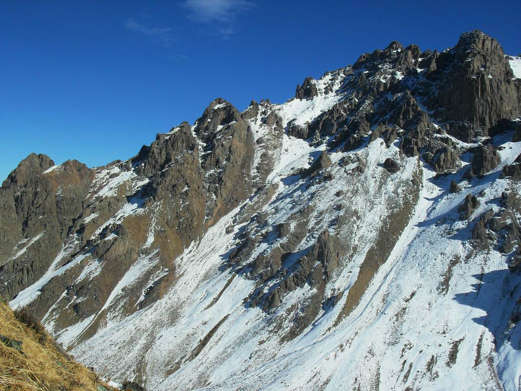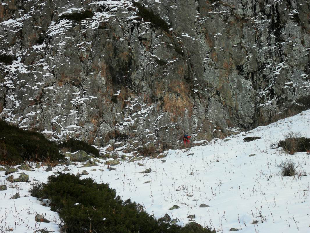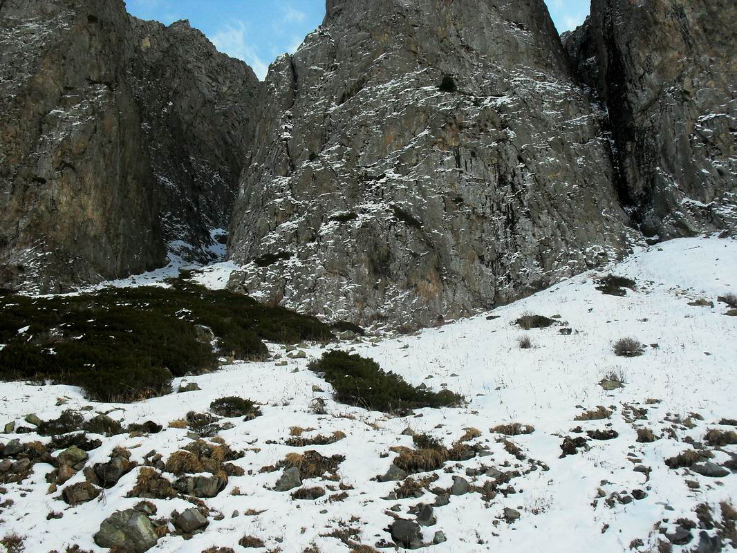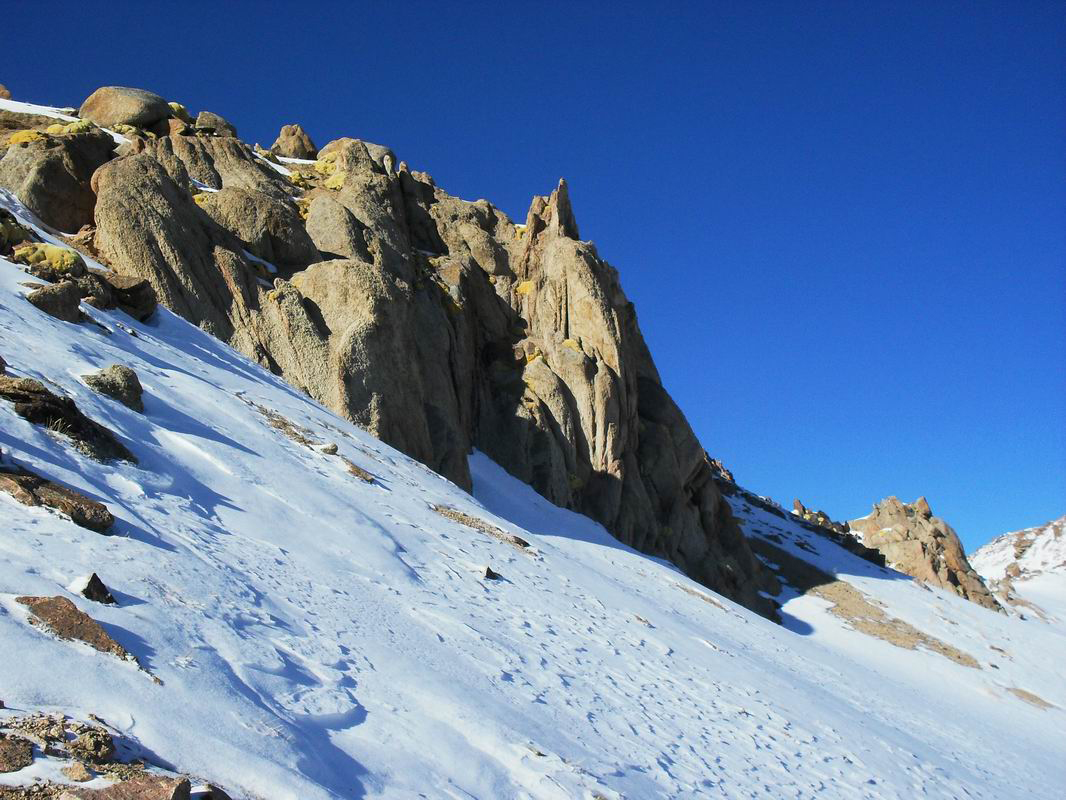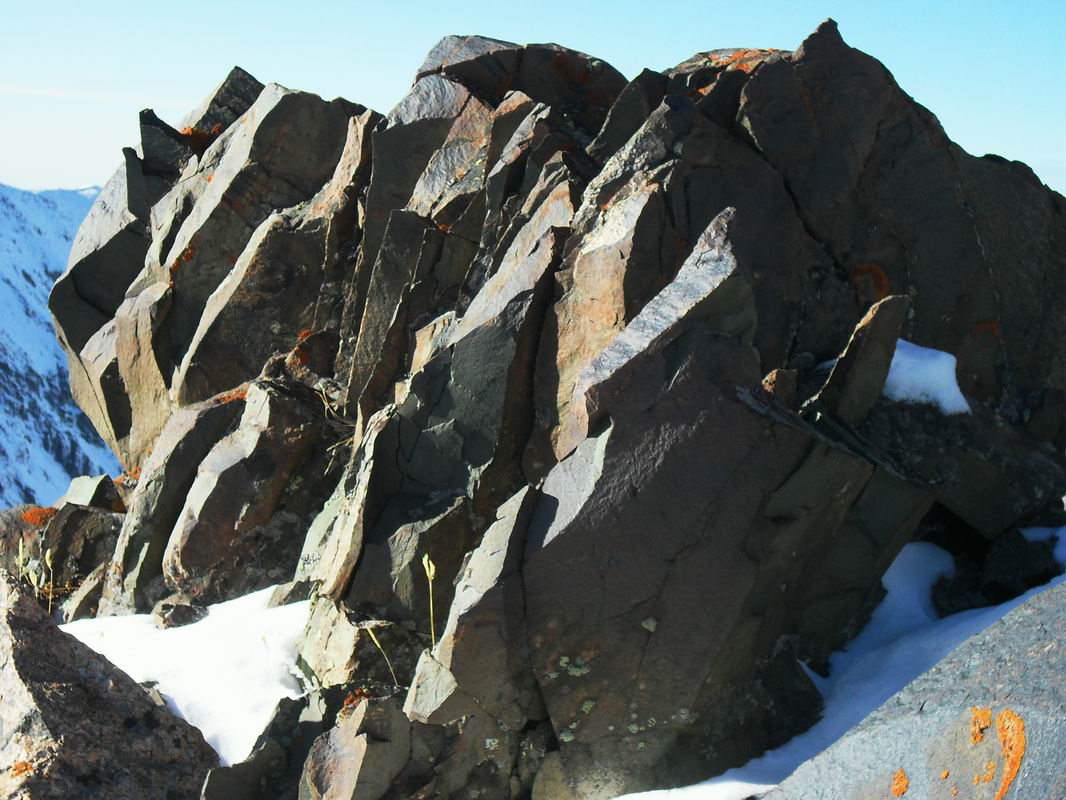 Вот, что значит юго-восточный склон — снега вообще нету! Есть только странного вида скалы. На всякий случай через каждые 10 шагов верчу головой и постоянно прислушиваюсь, и вообще стараюсь держаться от них на расстоянии — не известно, чего от них можно ожидать :-)