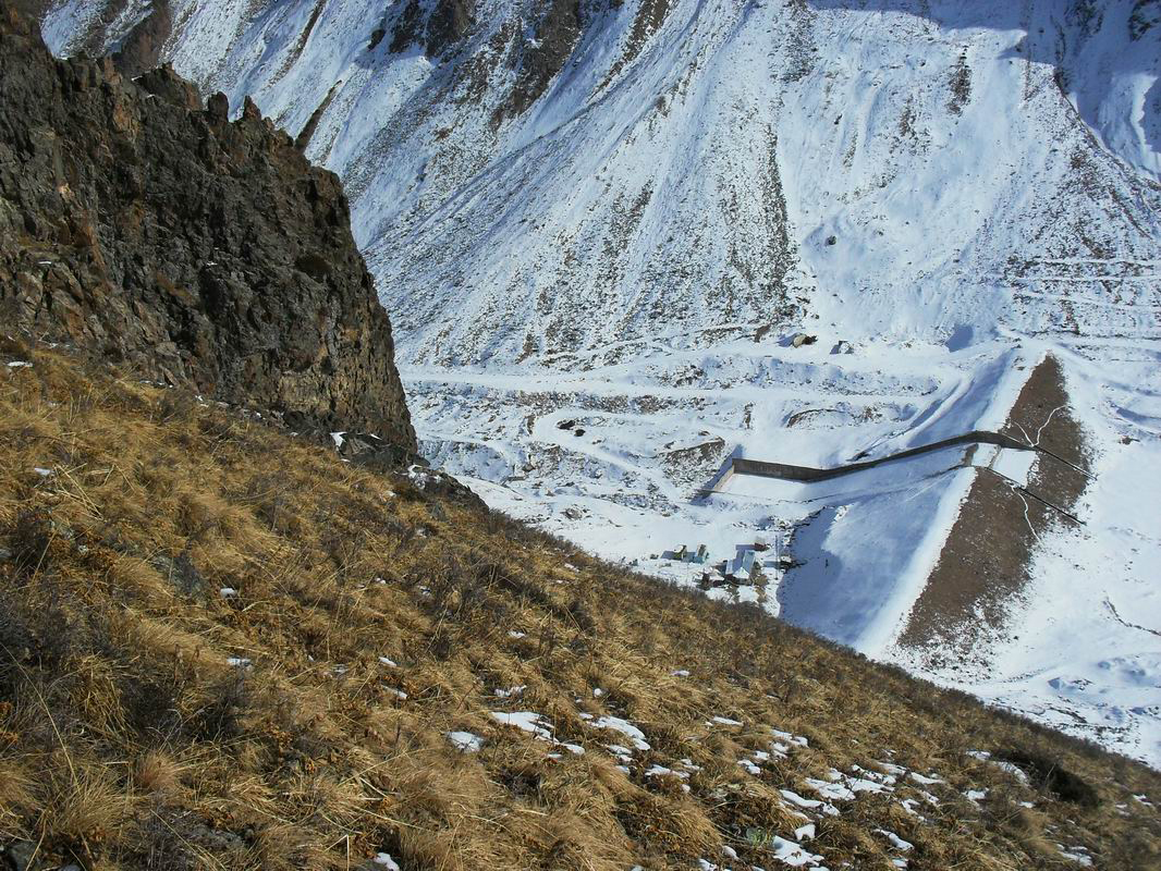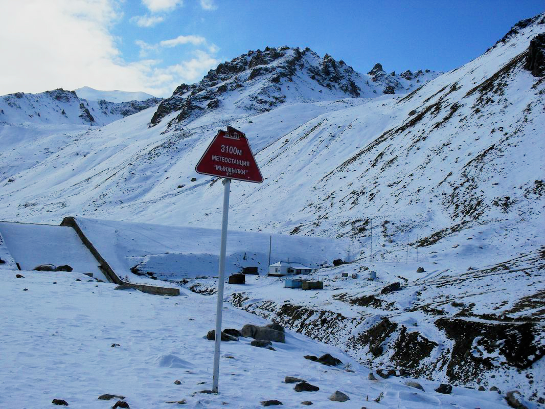 Я дошел до верхней плотины, называется: «Мынжылки», высота 3100 метров над уровнем моря. Чуть ниже центра фотографии, прямо под плотиной, видны домики одноименной метеорологической станции. Кроме этой в Алматы есть еще 4. Данные со станций в реальном времени поступают в центр Алматыметео, где обрабатываются и служат исходным материалом для формирования прогнозов погоды. Фактическую погоду прямо сейчас с этих станций можно посмотреть на странице Алматыметео. На станции Мынжылки множество хитрых дивайсов, черный кот, биллиардный стол и много другой прикольной всячины. Виртуально заглянуть туда и познакомиться с суровыми метеорологами можно благодаря статье на Vox Populi. А я сейчас поднимусь на эту плотинку и сразу направо, на склон.