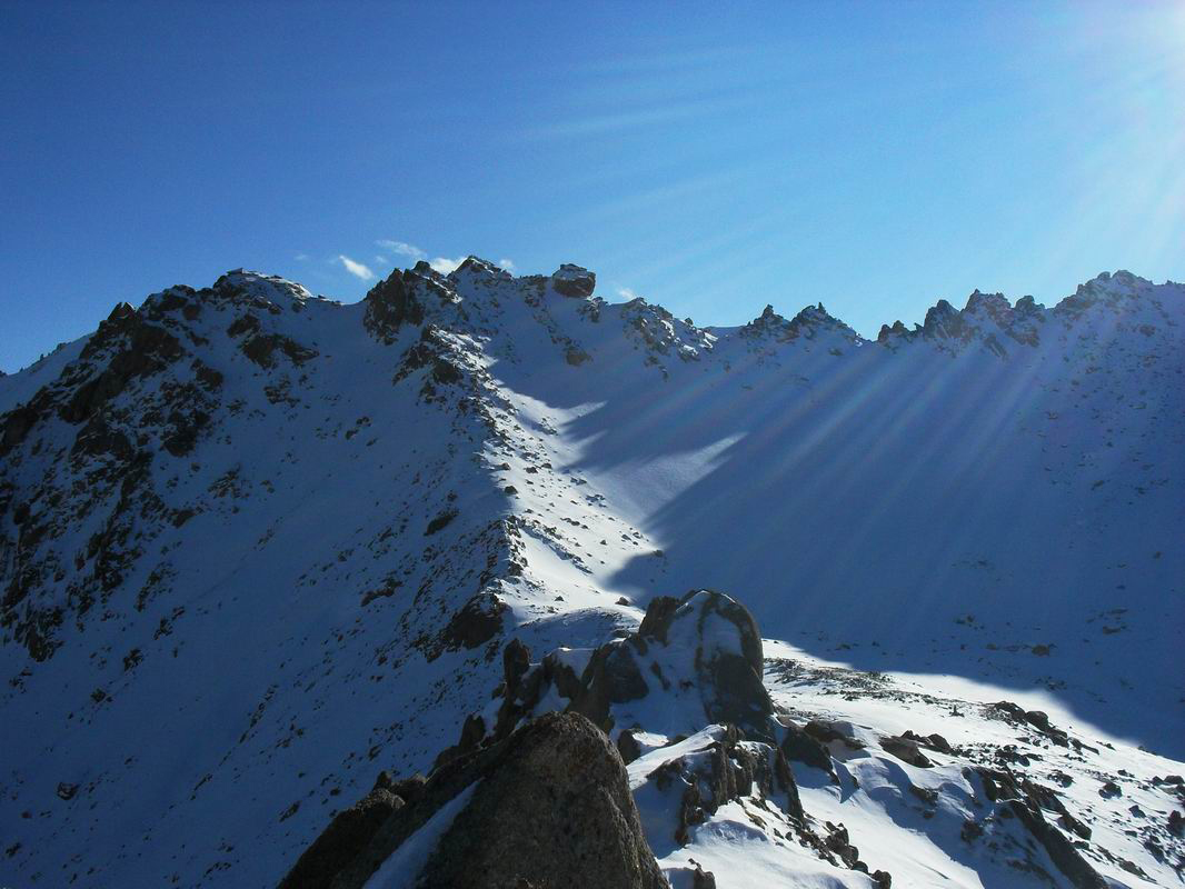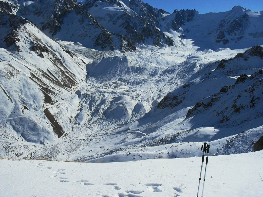 Вообще то, я уже около 5 часов на ногах, всё вверх и быстрым темпом. Уже тяжело. Наконец-то вроде бы и перевал! Здесь уже не совсем солнечная сторона, поэтому лежит снег. Вот мои ходильные палки и следы, идущие снизу. А вокруг — потрясающая панорама! Просто цирк какой-то! Кажется, он так и называется, цирк Туюк-Су. Внизу слева видны ниточки дорог; в верхней части фотографии самая правая вершина — Туюк-Су; слева от нее гроздь, похожая на гребешок, — вершина Иглы Туюк-Су; сразу после игл левее провальчик такой — перевал Туюк-Су; внизу у подножия в центре — ледники Иглы Туюк-Су и Туюк-Су. Есть еще река, но ее сейчас не видно. Ну, как она называется? А вот и не угадали! Она называется Малая Алматинка! :-)) Остальные вершины цирка тут не видны, но можно ознакомиться с названиями, если интересно, на mountain.kz, нижняя картинка кликабельна и увеличиваема.