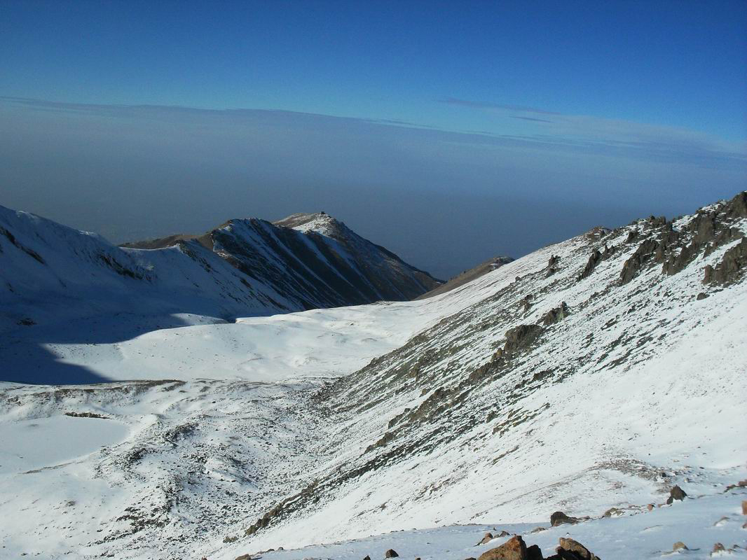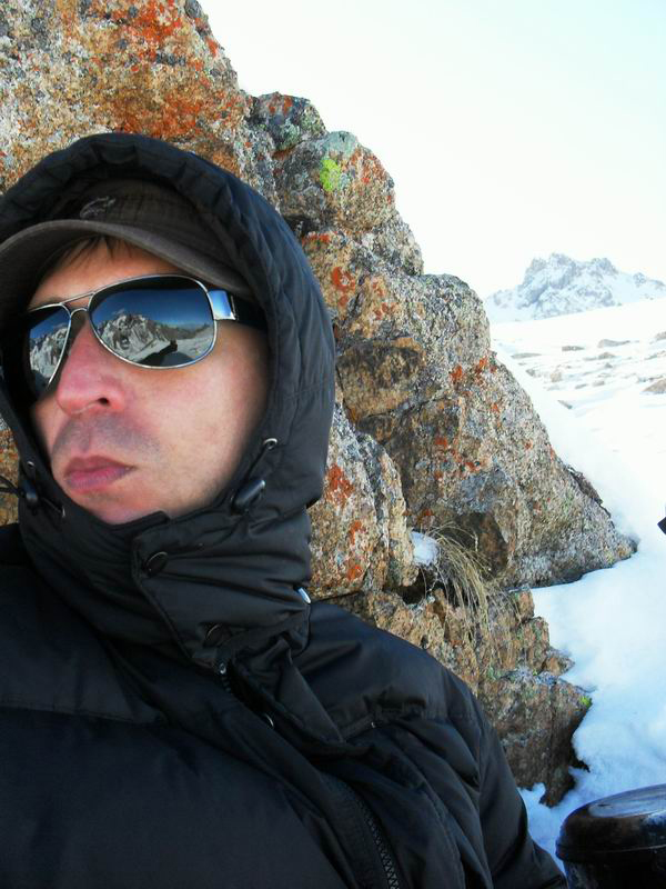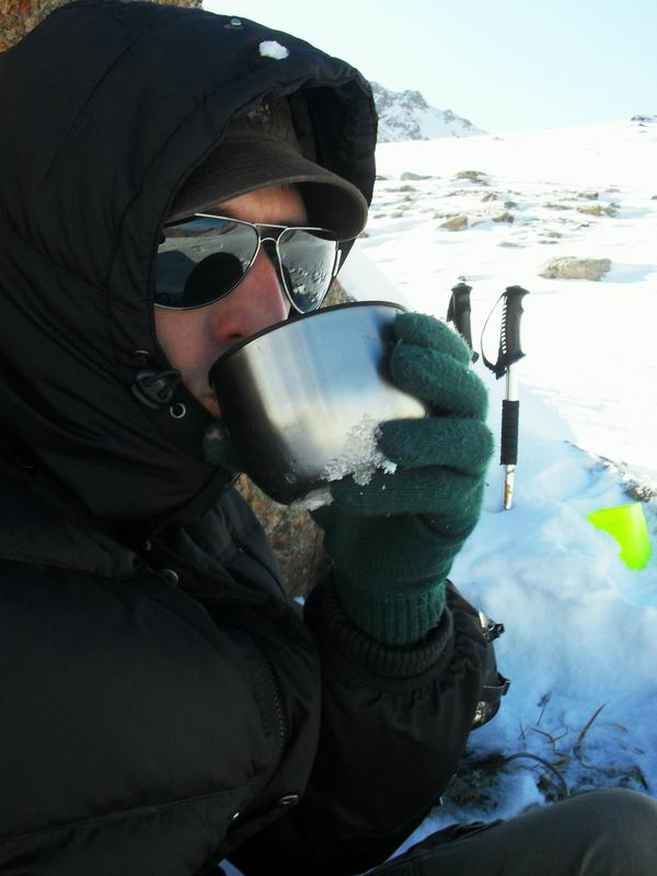 Здесь сейчас снег и крайне ветрено. Срочно надеваю пуховик. Периодически у меня на глазах, метрах в ста прямо посреди чистого неба над ущельем, образуются небольшие облака, — это совершенно удивительное зрелище! Я уже устал, один, в незнакомом месте. Если набегут облака и видимость исчезнет, можно начать плутать, это опасно. В общем, я решил объявить привал. Выбрал небольшую скалу, выкопал с подветренной стороны в глубоком снегу яму, расположился в ней поудобнее и заварил чай. Еды у меня было: немного кураги, пригоршня орехов и пара конфет.