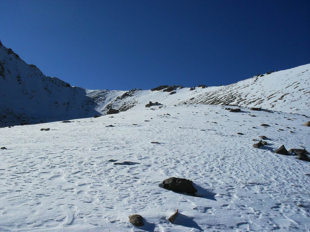 Пора уже сообщить, что я планировал подняться на перевал Титова. Но то, что я, одолев склон, принял за перевал Титова, оказалось вроде бы перевалом, но не Титова, а не известно, кого. Радостный, я поднимаюсь на этот перевальчик и вижу, что за ним — опять малоалматинское ущелье, из которого я, собственно, только что и поднялся, а никак не ущелье Горельник, как должно быть по всем правилам. Да, это явно не перевал Титова!.. А перевал Титова — явно еще дальше и выше, я его уже вижу.